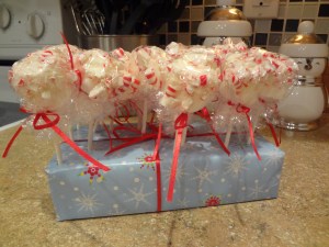The second snack and the inspiration for my peppermint theme was a white chocolate dipped marshmallow that is then rolled in peppermint crumbles. These were very easy and fun to assemble. I crumbled the peppermint first. I put lollipop sticks into marshmallows before I melted the white chocolate. Once the white chocolate was fully melted, I set off dipping and rolling. It’s important to let as much extra chocolate drip off as possible. Rolling the marshmallow in peppermint was a little trickier than I expected, but it turned out great. I let the marshmallow pops cool on wax paper. Once the chocolate was set, I wrapped the marshmallows in plastic wrap