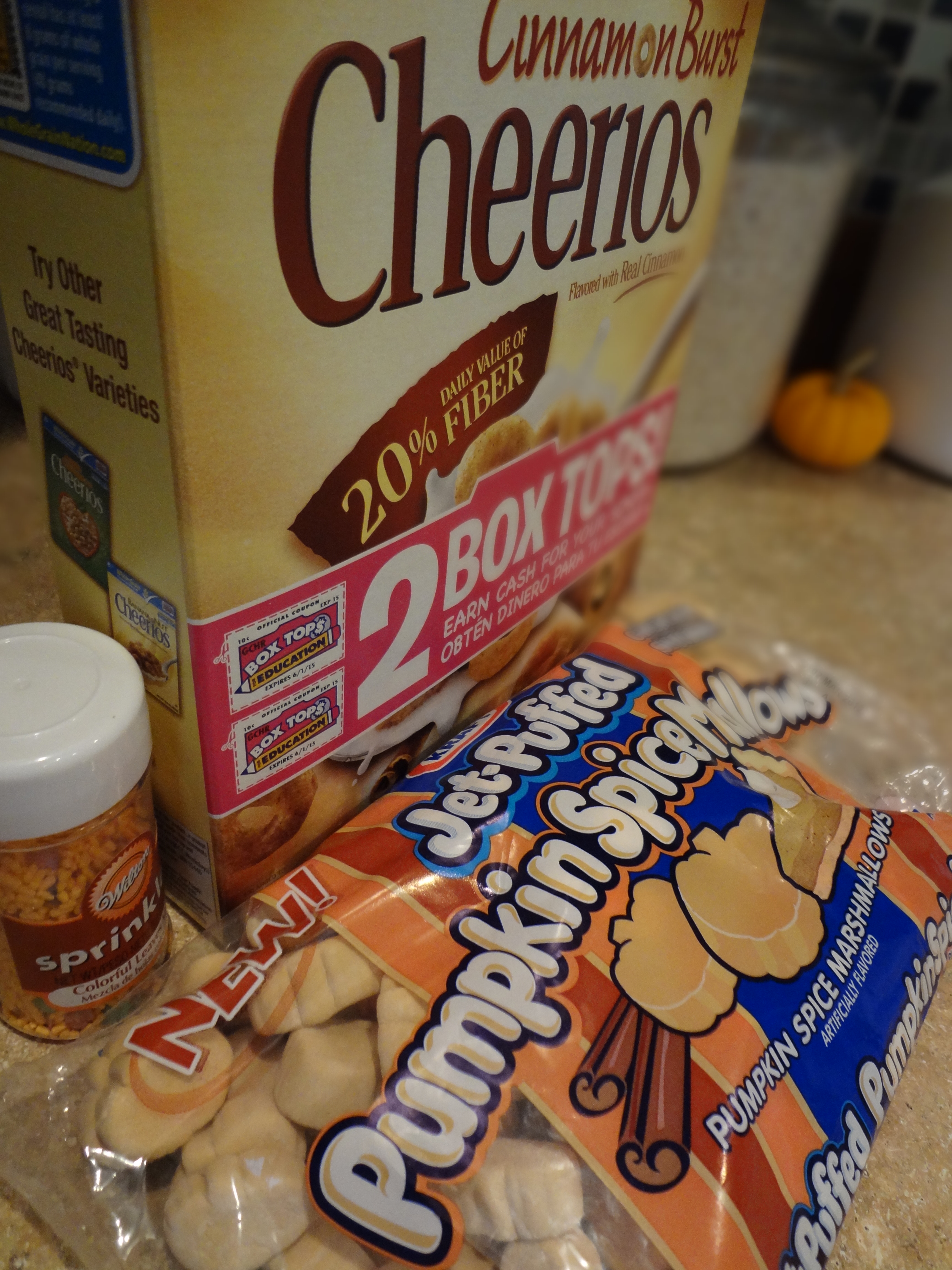 I started to think about what I could do with all these marshmallows. The bag of pumpkin spice ones had been opened, but the majority of it was left uneaten. I let my mind wander and I came up with the idea of using the pumpkin spice marshmallows to make some kind of marshmallow treat. Now the classic is Rice Krispy Treats, but I wanted to stay with the fall theme. After exploring the cereal aisle yesterday, I landed on Cinnamon Burst Cheerios. I figured the cinnamon and pumpkin combination would make for a yummy autumn treat.