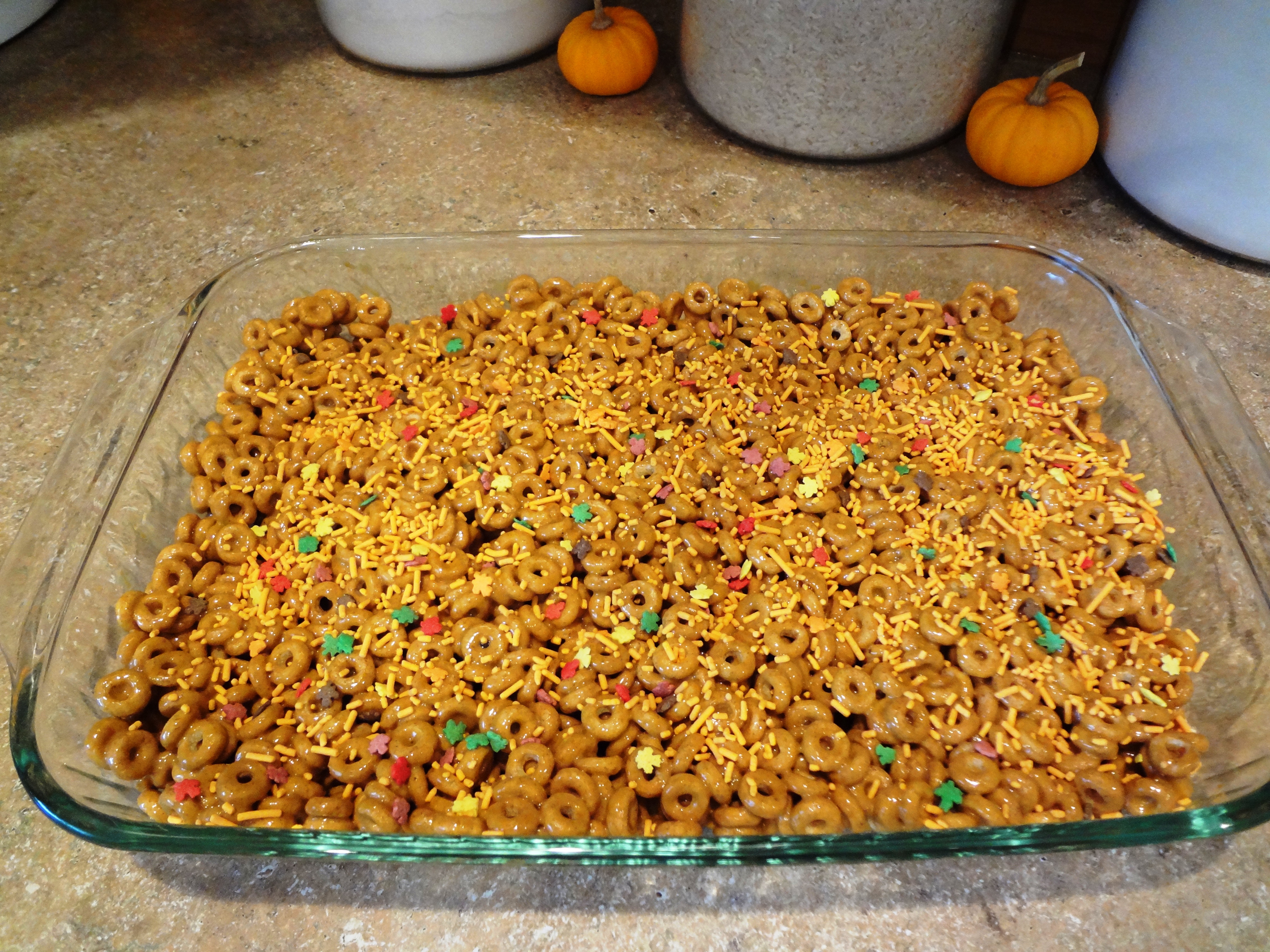 This afternoon I assembled what I am calling Pumpkin Spice Cereal Treats. Using the basic Rice Krispy Treat recipe, I mixed my fall inspired ingredients together to create a yummy marshmallow treat. The recipe on the back of the bag said you could decorate using candy corn or another fall candy. I didn’t think the flavors would mix well, so I used Wilton’s Colorful Leaves Sprinkle Mix. I thought they would add to the fall theme without adding another flavor layer.