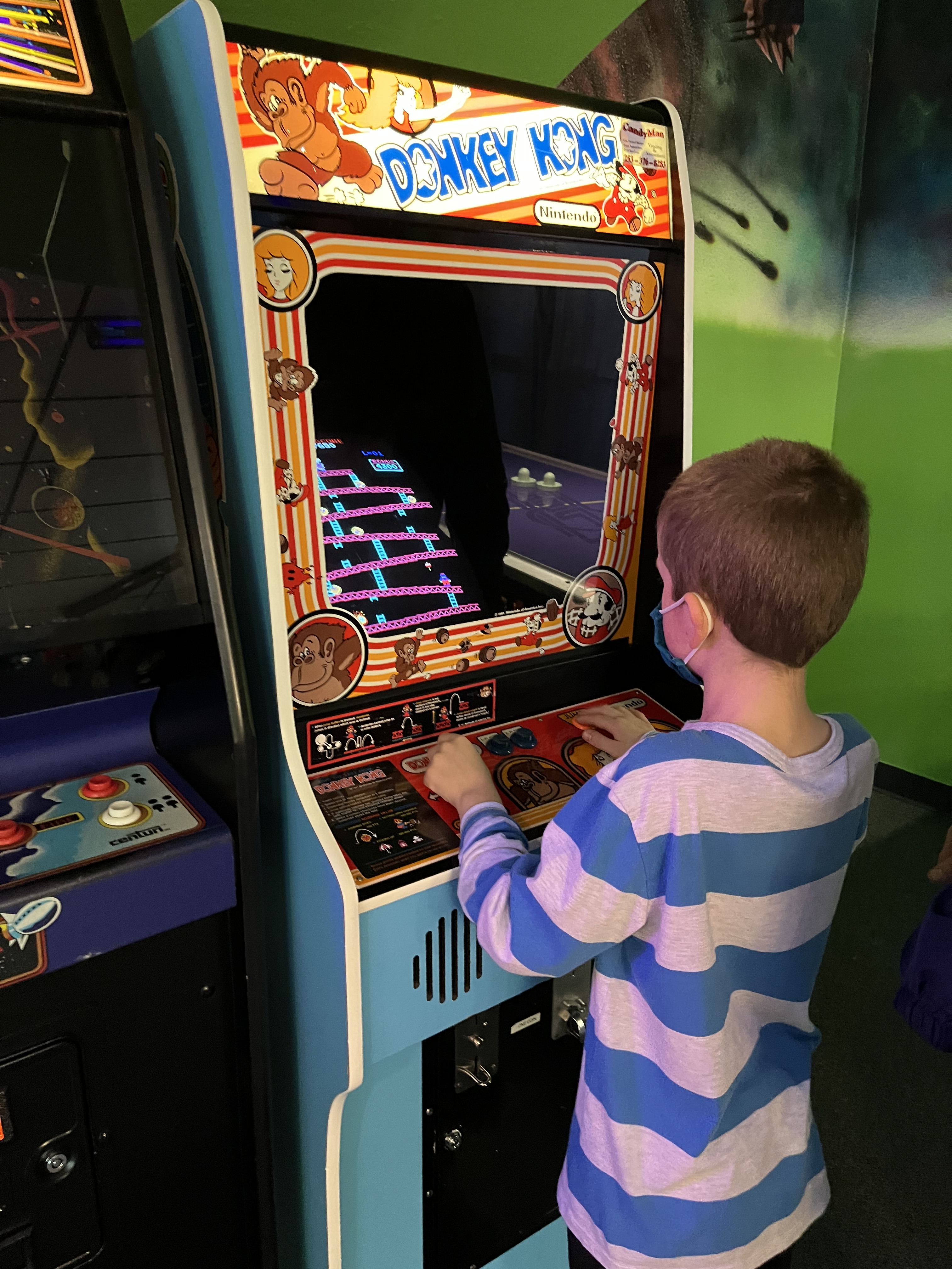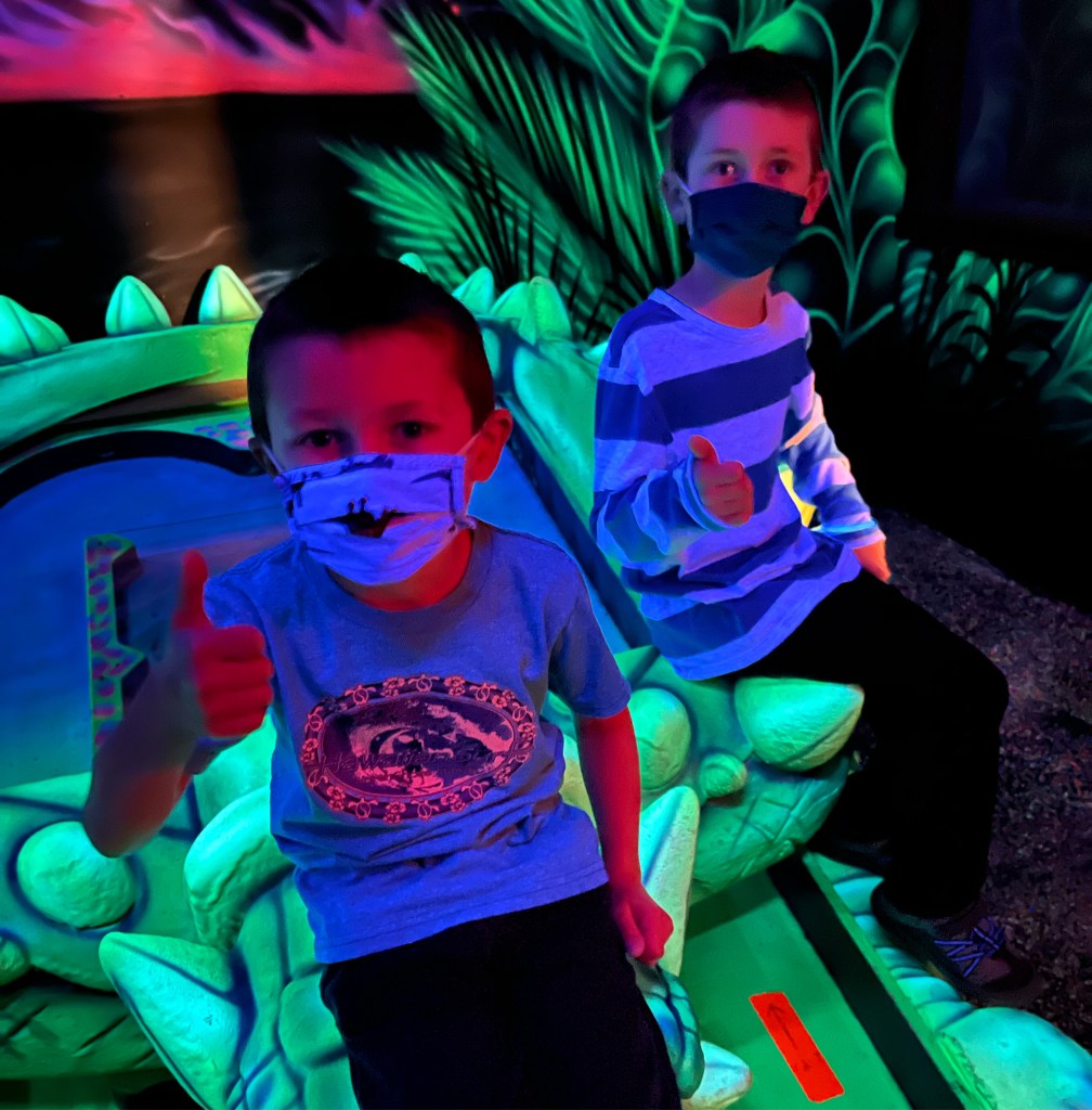 On Saturday, Nana and Papa invited us to join them for glow-in-the-dark golf with some of the cousins. We love cousin time! And surprisingly, for glow golf being a local activity, we had never been before. It was a win-win – time with family and a fun outing! I’m not a great golfer (mini golf or otherwise), but this glow golf course was right up my alley. I completed a majority of the holes in three strokes instead of my usual six or more. It was very good for my confidence! After we wrapped up golf, Nana and Papa treated the kids to a few arcade games in the lobby. They loved every moment of the outing.