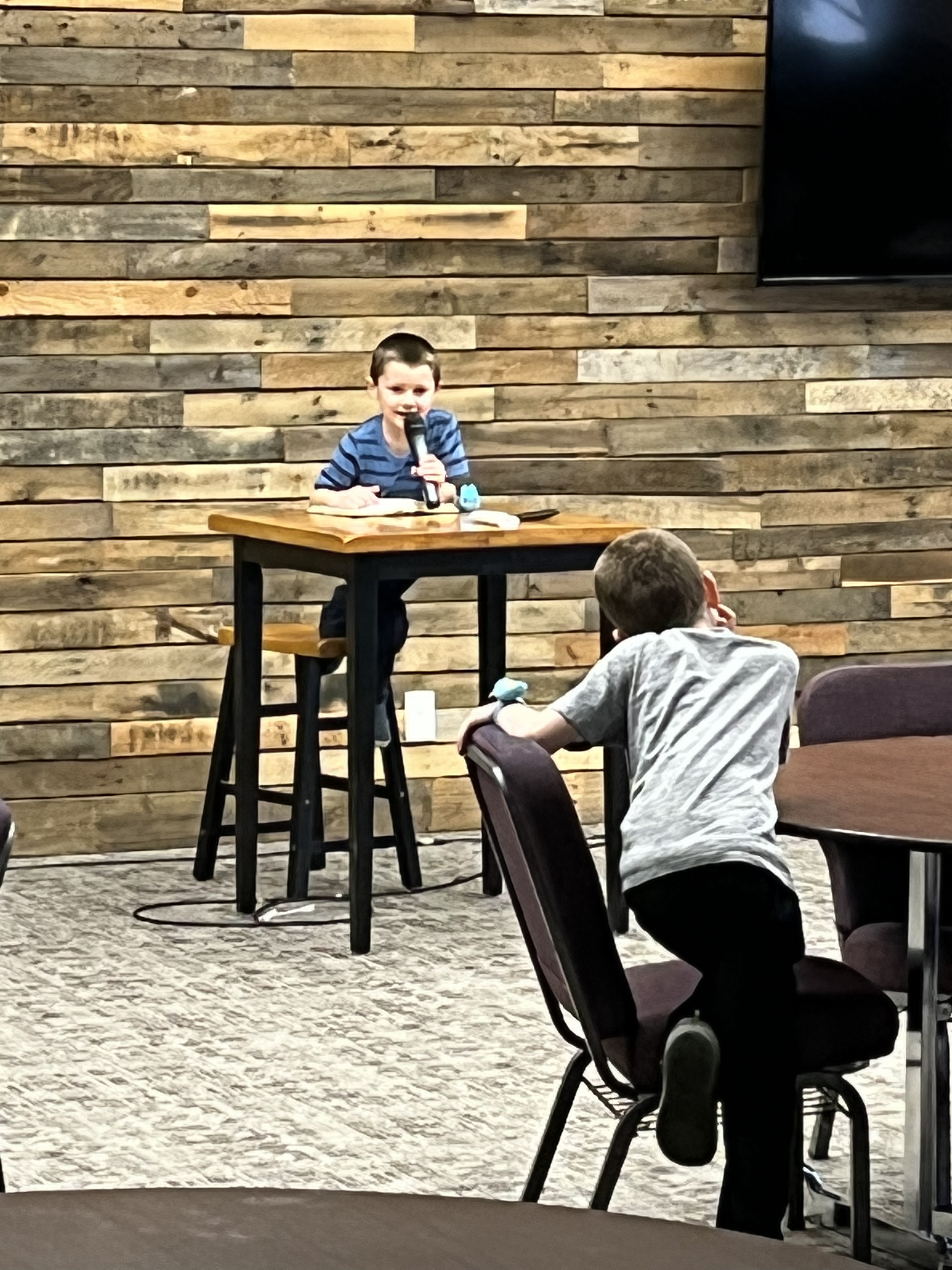I had a migraine yesterday, so the boys joined Jeremy for an out-of-town errand and then an afternoon of helping at the church. Jeremy sent me this picture of Graham leading a “Bible study” in the church’s church classroom! Graham has been watching Jeremy in action on Sundays and it shows!