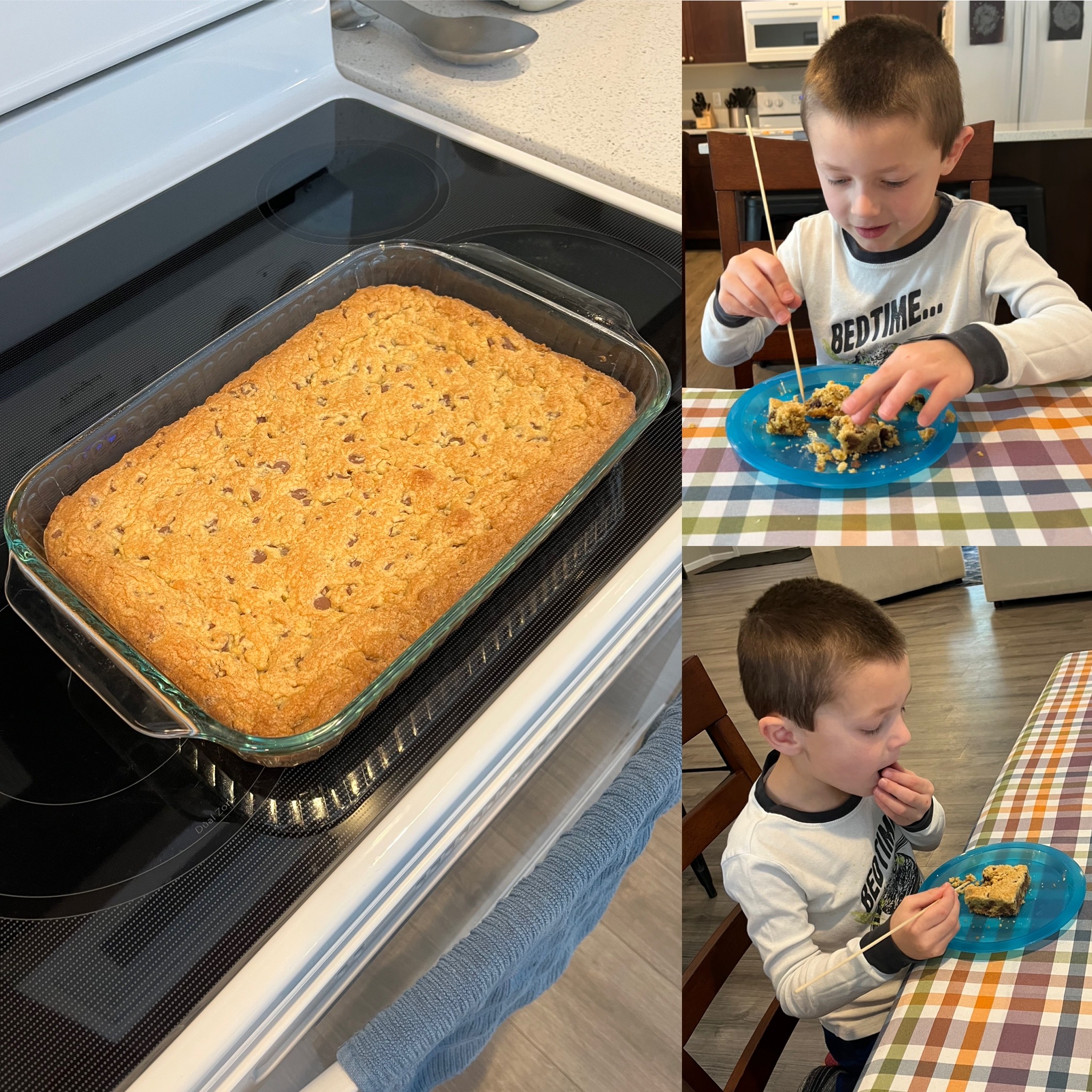 Graham’s science lesson called for chocolate chip cookies so he could excavate the chips like paleontologist do with fossils. I was too lazy to scoop cookies so I went the bar cookie route. Graham enjoyed the experiment and kept eating the “fossils” he found!