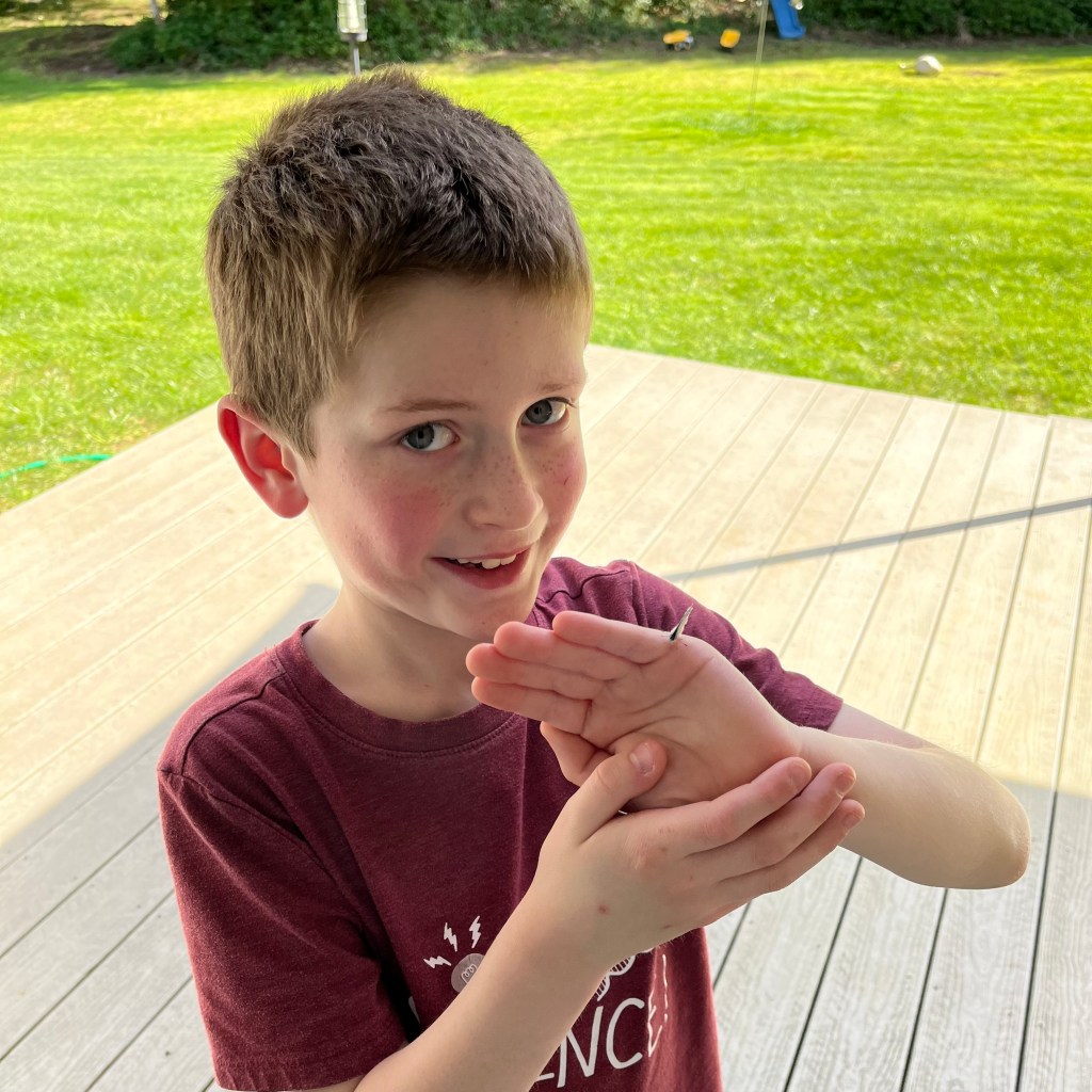 Last Thursday was 78 degrees and the boys were in summer mode. Owen made friends with a tiny moth.