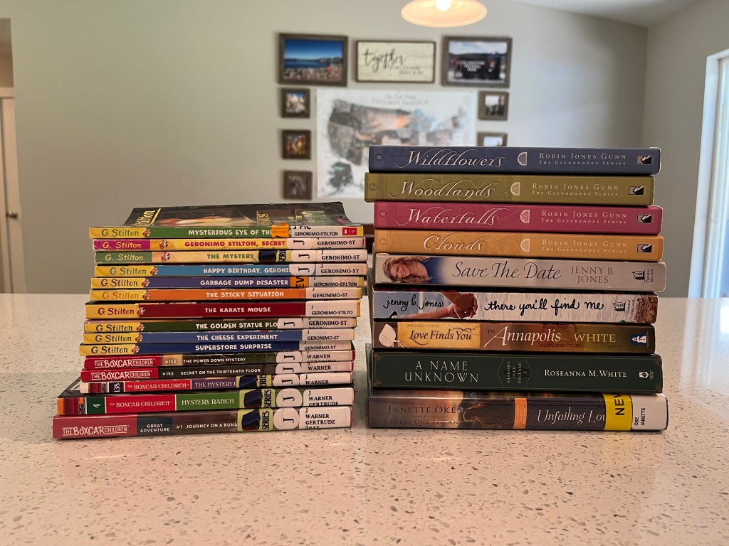 Owen and Amy’s July reads: Owen has been reading quite a bit during this quiet time at home. I took this picture on Wednesday and he has already added 2 more books to this stack. You can add 9 books to my stack on the right. 7 eBooks and 2 more books that I finished after taking this photo.