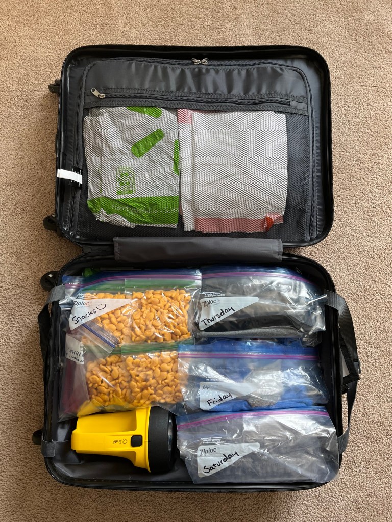 I went a little OCD and labeled everything in Owen’s suitcase. Everything is ziplocked to keep things clean, dry, and easy to find. And yes, that’s a lot of crackers, but he is so picky. I wanted something I knew he would eat at camp.